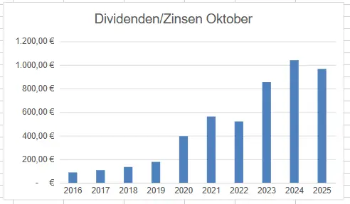 Bei den Dividenden gab es diesen Monat etwas weniger als im Vorjahr. Etwa 960 Euro kamen rein. Letztes Jahr waren es knapp über 1000 Euro. Grund sind weniger Zinsen, die letztes Jahr noch fast 100 Euro ausgemacht haben, dieses Jahr keine 10. Auch der Dollarkurs ist deutlich unter dem Vorjahr.
