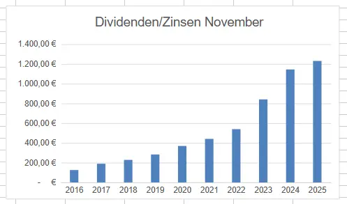Im Dezember sollten nochmal über 1000 Euro Dividenden reinkommen. Mein Lieblingsmonat ist es sonst nicht, gefühlt ist alles stressig. Geschenke, Erledigungen, Termine. Im Grunde bin ich immer froh, wenn der Januar da ist und ich noch ein paar Tage Urlaub habe, in denen ich einfach daheim hocken kann.