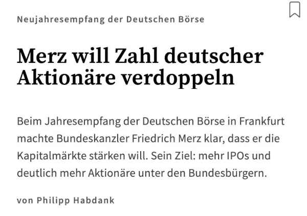 Friedrich Merz besitzt eine beeindruckende Superkraft: Wo immer er auftaucht, findet er exakt die Vokabeln, die sein Publikum hören will. Beim Neujahrsempfang der Deutschen Börse gab er den „Mr. Market“ und warb leidenschaftlich für mehr Aktienbesitz in der breiten Bevölkerung.