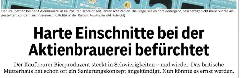 Genau das könnte dieses Jahr Realität werden: Vertriebsmitarbeiter der Brauerei sollen Veranstaltern bereits mitgeteilt haben, dass sie Lieferungen für größere Sommerfeste ab Mai wohl nicht mehr garantieren können. Die Aktienbrauerei Kaufbeuren steckt tief in den roten Zahlen, und das schon seit Jahren.